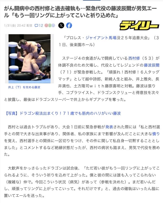 西村修さんの訃報に接し、深い悲しみを感じています。彼はプロレス界だけでなく、文京区のために尽力された素晴らしい議員でした。闘病生活を送りながらも多くの人々に勇気を与えた彼の姿勢は、決して忘れられません。心よりご冥福をお祈り申し上げます。